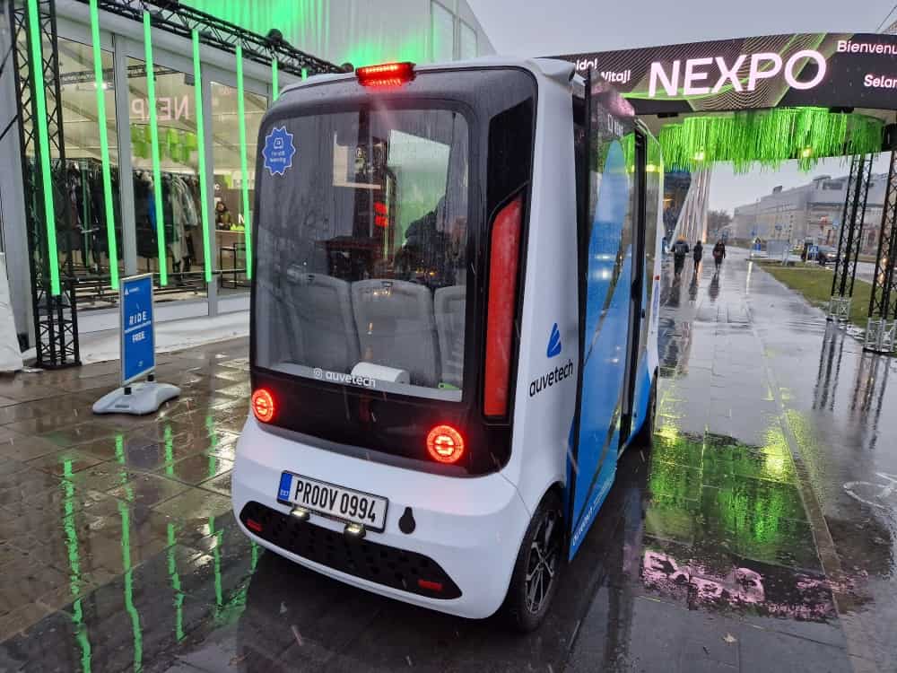 Right outside the white tent hosting the NEXPO, there’s a bus stop where visitors can hop on an autonomous bus operated by Auve Tech. The bus can have up to eight people onboard. Although autonomous, current legislation requires an operator to be onboard. The journey starts after a signal to the command center, and the bus moves seamlessly through the predetermined route despite the snowy weather. Screens show the speed and the nearby obstacles detected by the multiple sensors embedded in the vehicle.