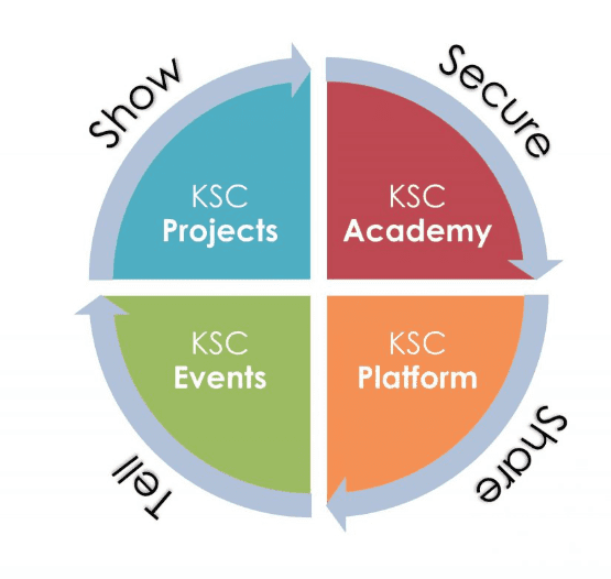 In terms of content, the Knowledge Sharing Centre is built on four pillars: first is the platform (KSC Platform), with physical and digital forms of knowledge exchange, one-on-one or in groups. Then there is the work on projects (KSC Projects), often based on successful practical examples at one of the participants. As a third pillar, there are the events (KSC Events) around the theory and practice of knowledge sharing: how do you actually do that? The last leg is about specific consulting for companies and individual participants (KSC Academy).