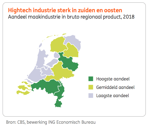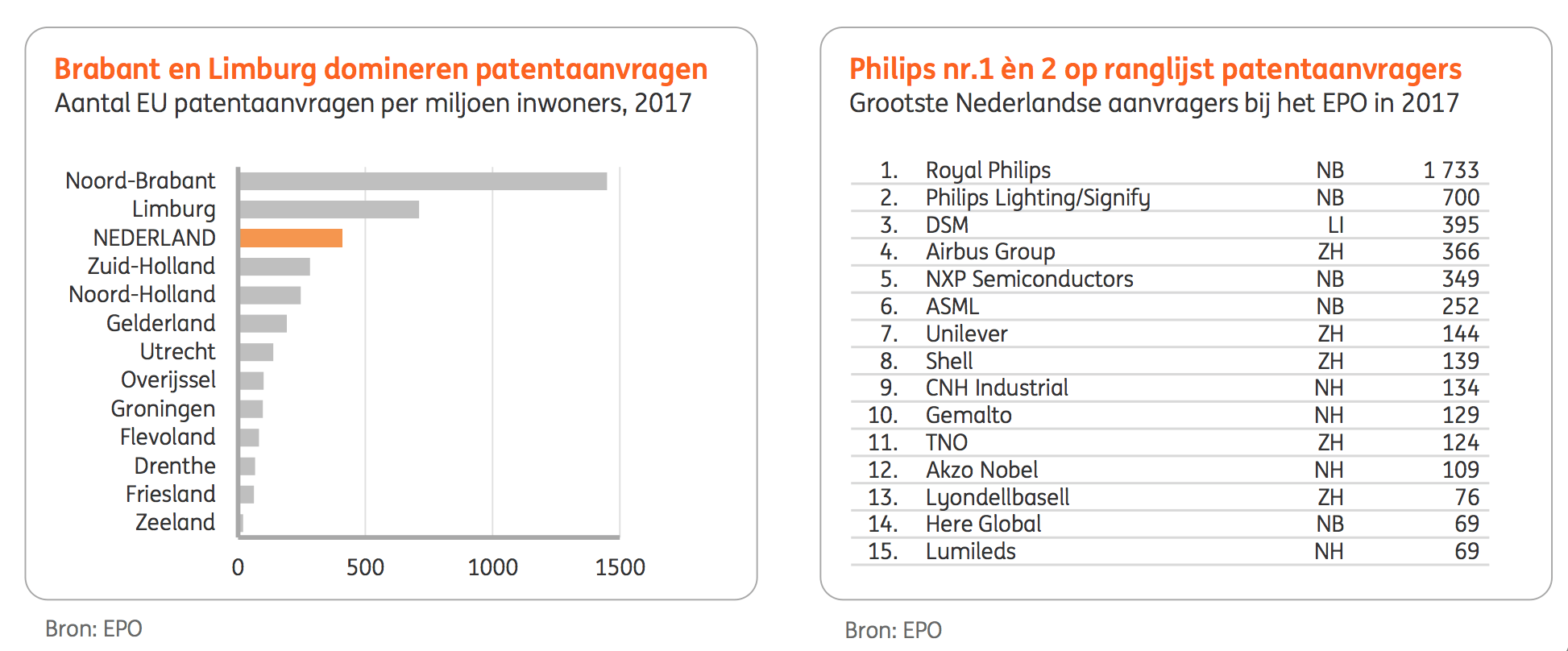 Brabant companies account for half of all Dutch patent applications, companies in Eindhoven for 40%. The first place in the field of innovative investments is the result. Limburg ranks 2nd here. DSM and Océ together accounted for €335 million in domestic R&D expenditure. “For Limburg, the Brightlands Chemelot Campus is an important hub,” says ING. “The growth in the number of companies and jobs, together with the clustering of production and research, strengthens the position of the chemical industry in the region in particular.” The high-tech industry in North Limburg has many links to the Brainport Eindhoven successes.