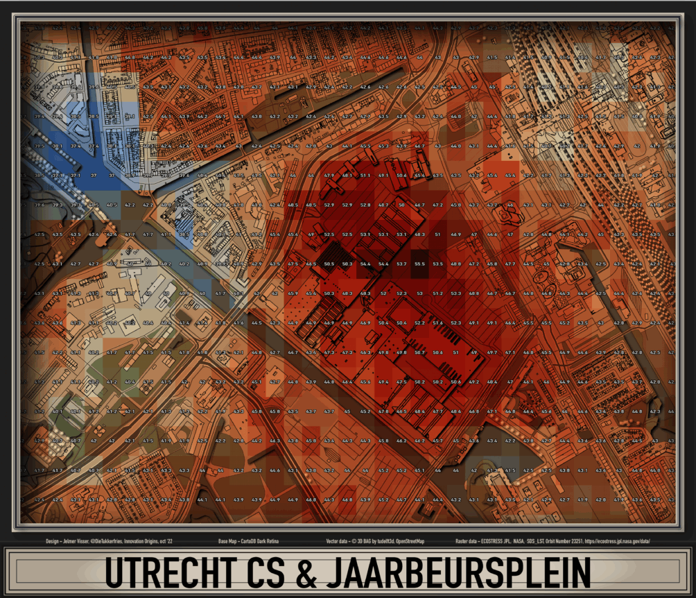 You won’t get a clearer picture of heat islands in the Netherlands. The Jaarbeurs and adjacent parking lots form a bright red oil slick on the map of Utrecht. Readings of 50℃ or higher usually only show up on furniture boulevards and industrial areas.