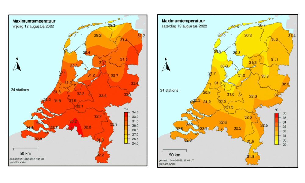 In this final episode, we look back through some of the rankings and classifications. We will begin with the two city centers that were the best of all in terms of withstanding the heat, according to the ECOSTRESS satellite data. Then comes the coolest residential areas and the hottest environments that we came across. And finally, the fence-sitters of the Dutch heat stress test. All analyses used the very sunny and hot weekend of Aug. 12 and 13 as the benchmark. This is what the KNMI weather maps looked like at that time.