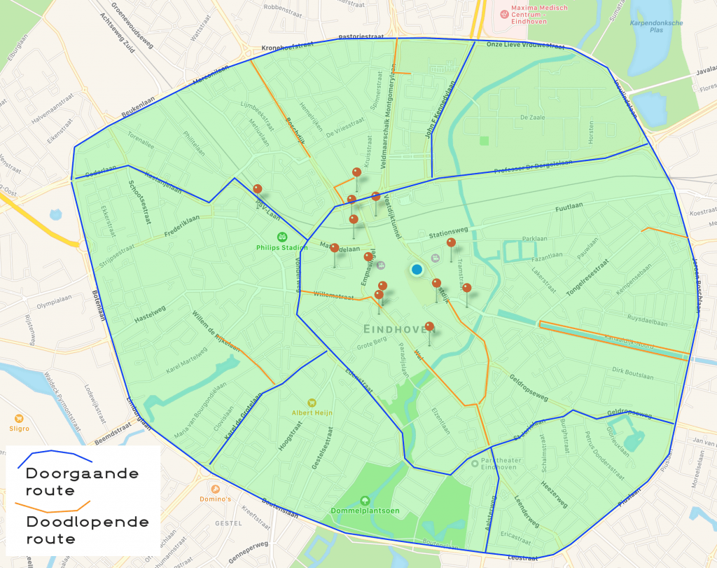 But what about visitors, my grandmother, emergency services? Those are the first questions you hear when you propose to really arrange things differently. ‘With an app!’ is the far too easy answer. The posts are mostly psychological. They’re there to prevent people who don’t live in the neighborhoods of Eindhoven from driving through them. To prevent searching traffic. Smart posts with smart number plate identification can be connected to an app. Give every inhabitant the possibility to temporarily give a number plate access. Just enter the number plate and visitors can come by. Parking costs for the visit are directly met in the same way, which saves parking meters. Of course, such a system can be abused. But the effect is that you can only deliberately drive into the residential areas inside the ring road.