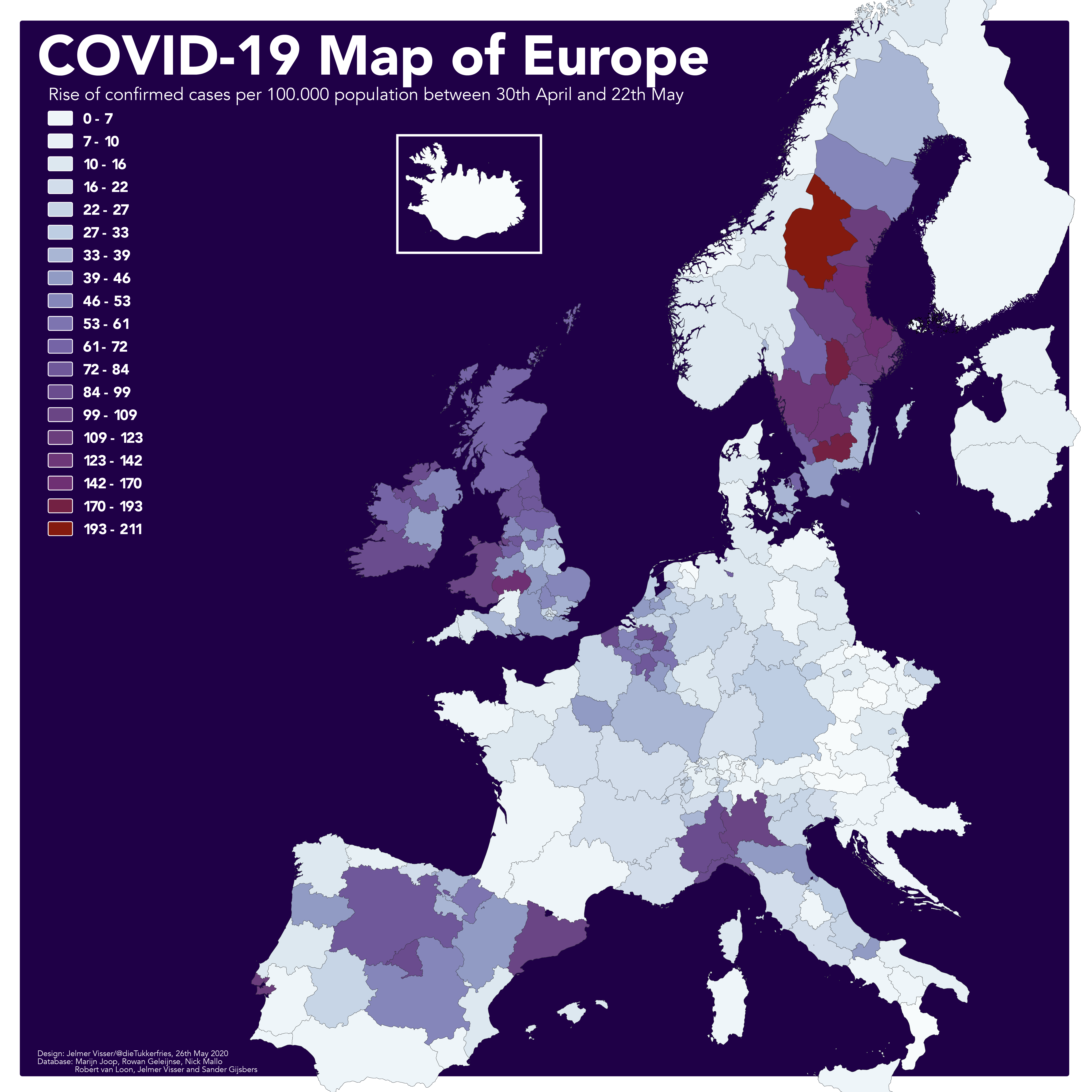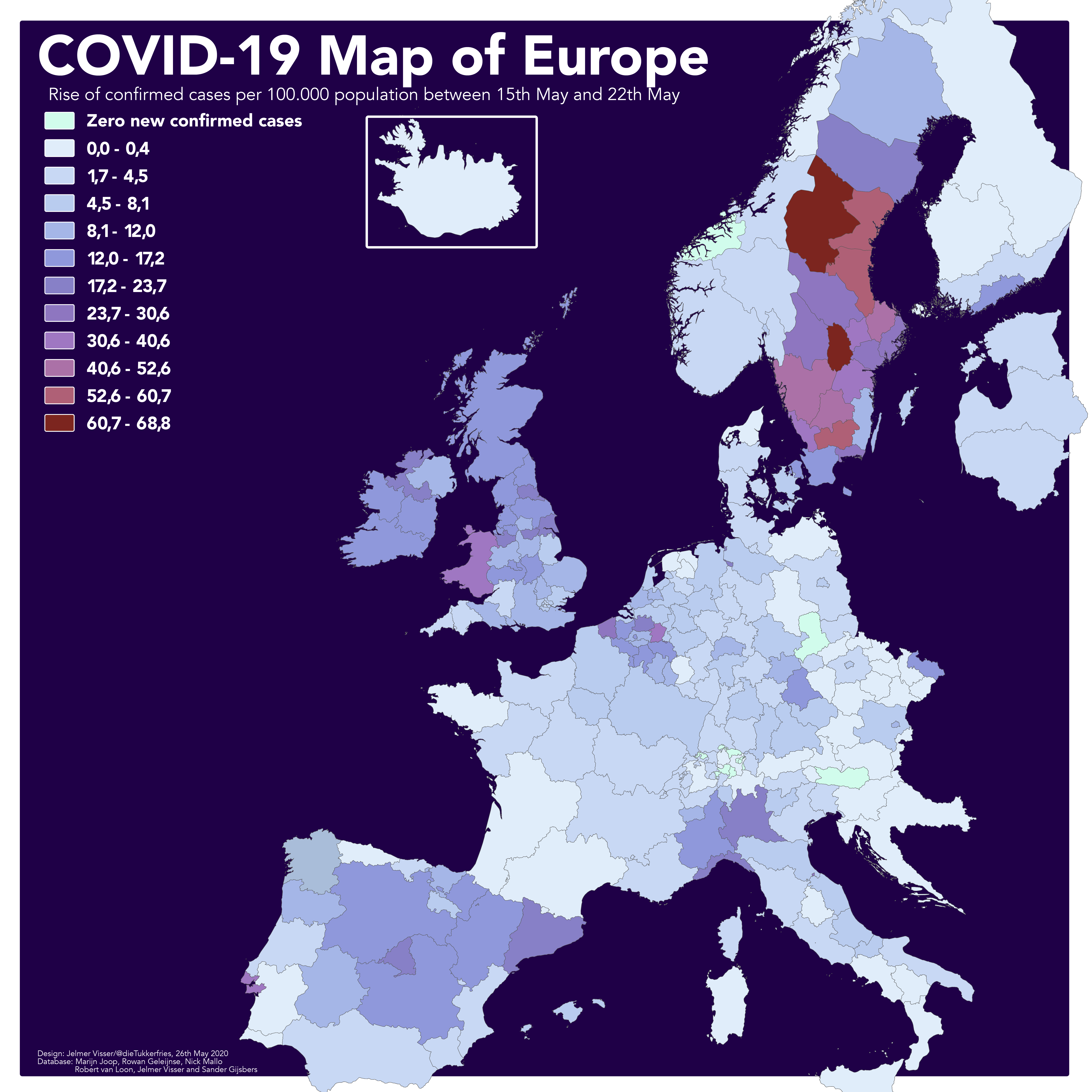 The blue hues in Sweden are getting lighter and lighter. Although the Scandinavian country with its defiant corona policy was one of the least affected countries at the start of April, their situation is altogether different now. This process of ‘catching up’ is even more evident in the image below featuring just the new diagnoses in the period May 15 to 22.