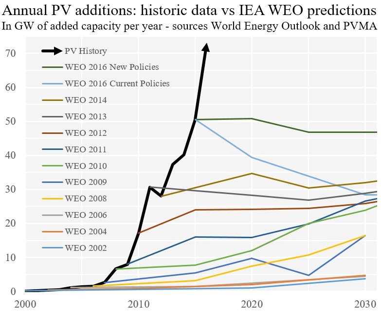 “With every doubling of production, solar cells become 20% cheaper. Over the past 50 years, they’ve become 100 times cheaper. And if you look at this picture (see below), you’ll see that their yearly production is skyrocketing and that makes them cheaper. In the beginning, everyone was yelling that solar cells would only be suitable for space travel, but take a look now! These developments are exponential. This is because we can make solar cells relatively quickly and in small quantities. And with every new incarnation, a new generation emerges where faults from the previous series are fixed. In turn, everyone is able to build on the knowledge that has been gained, so developments gain rapid momentum.”