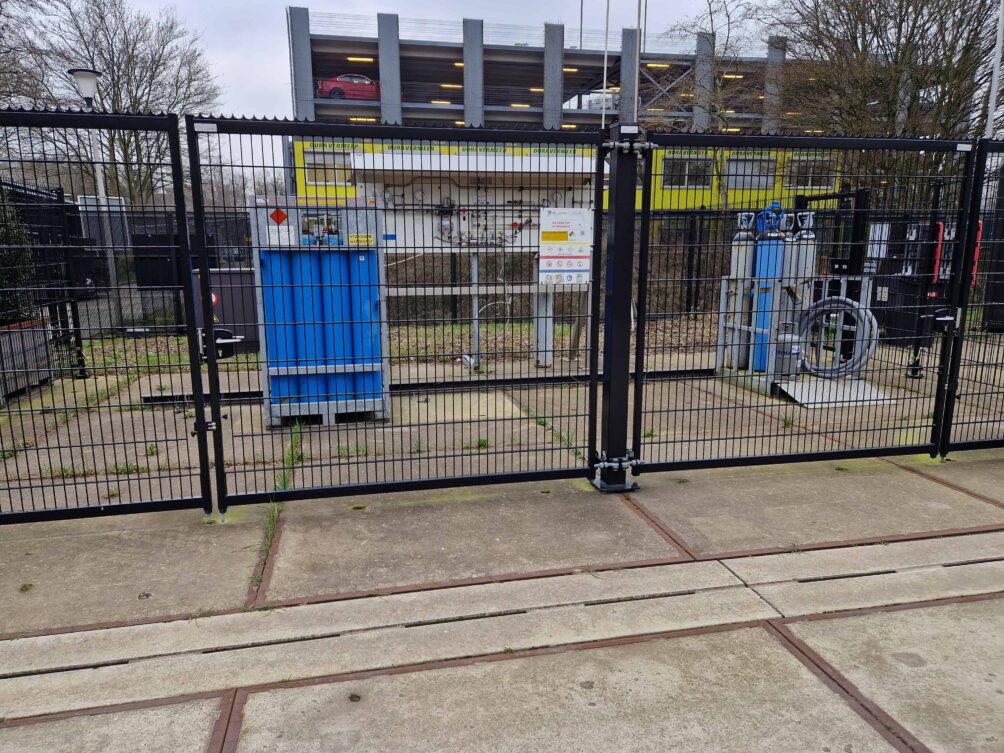 Walking from HittePlein – the “heat square” where heat stress adaptation innovations are showcased – a fenced area appears. Safety signs hanging on the iron net and blue cylinders signal a hydrogen facility. The three main network operators in the Netherlands—Alliander, Enexis Groep, and Stedin—built a conventional natural gas grid on campus to research possible hydrogen applications. The facility has been active for nearly four years now.