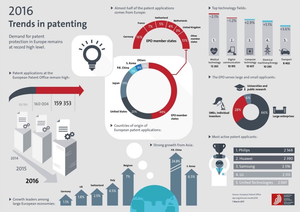 The total amount of patent applications with the EPO in 2016 (159.353) is slightly lower than the total amount in 2015: 0.4 percent. The total amount of granted patents however is a lot higher than it was a year ago: with 95.940 that number has seen a rise of 40.2 percent.