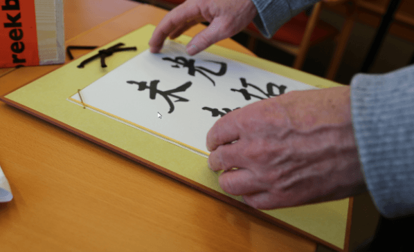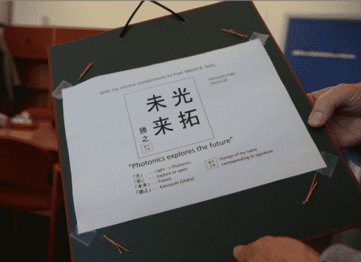 I got it from Prof. Utaka from Waseda University, who worked in our Lab for a few months. His hobby was calligraphy of Japanese characters. He gave it to me when he left our group. It means: Photonics lights the future.