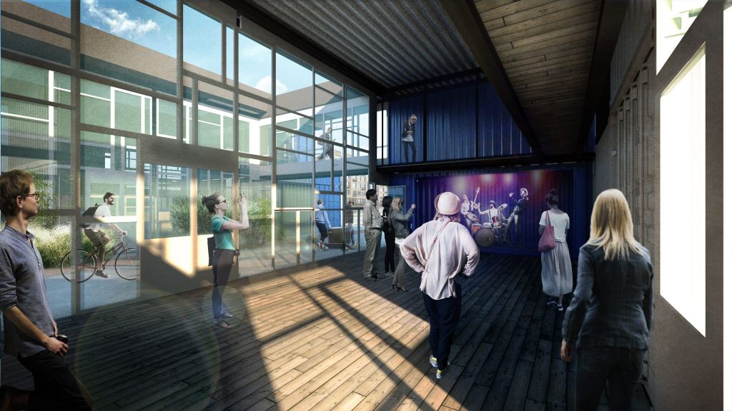 The basic structure of Plug-In-City consists of a grid of 24 sea containers, stacked in two layers with a collective roof on top of it. Walkways connect the containers to the top layer. Workshops for creative businesses are being developed in the containers. In collective atriums, there is also a machine shop, a flex office, a workshop space and a large event room with a bar and a stage. A path will be constructed through the village and visitors can look inside. Luiting:”The design shows the public how to reuse materials.”