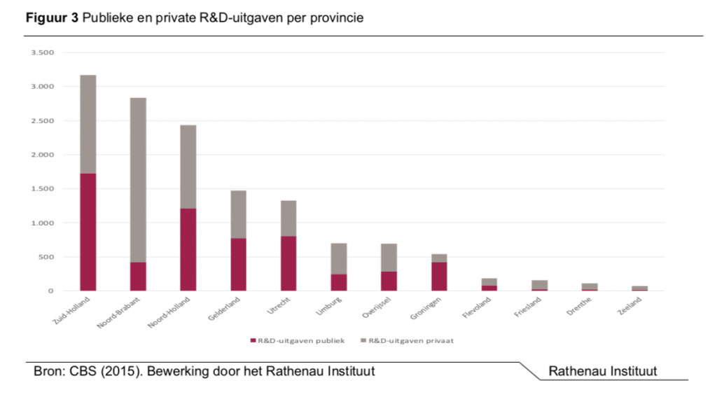 Zuid-Holland has the most R&D expenditure, with an almost equal distribution between the public (including universities, TNO and UMC) and the private sector. In North Brabant, on the other hand, private R&D spending dominates (including by ASML, Philips, and NXP); there’s a sharp difference compared to public R&D spending. The two universities in Noord-Brabant – Eindhoven and Tilburg – account for the major share of this public contribution, says Jasper Deursen at Rathenau. In addition, according to him, a (smaller) part comes from the Dutch Defence Academy in Breda and the universities of applied sciences in the province.