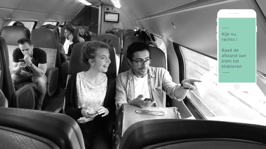 “We have made a game that consists of a number of challenges, especially for one route, with which you can play realtime with and against your fellow traveler. They aren’t only knowledge questions, there are also different types of challenges that we want people to complete in a playful way on the track. An example of such a question is: ‘In ten seconds, you’re passing a church tower, is it on the left or on the right side of the railway?’ That makes sure you really have to look outside and start looking. That way we try to involve the environment in the type of questions we ask. On the basis of all we design is the question: ‘What does it give you in a broader context?’ In that case, the idea behind it is that you don’t want someone to be completely absorbed in his phone, without him or her noticing that you’re traveling through a fantastic landscape.”