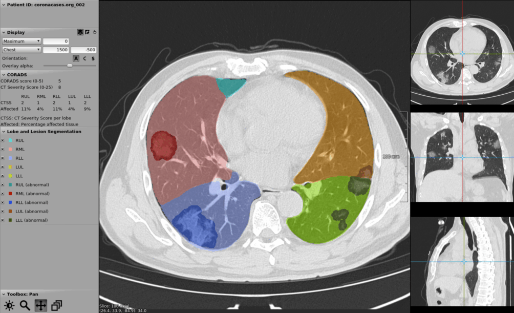 Although the course of the disease varies per patient, a CT scan of covid lungs is often surprisingly recognizable. “Pneumonia due to COVID-19 usually has a typical pattern with abnormalities at the edges of both lungs that is fairly easy to recognize with our algorithms.”