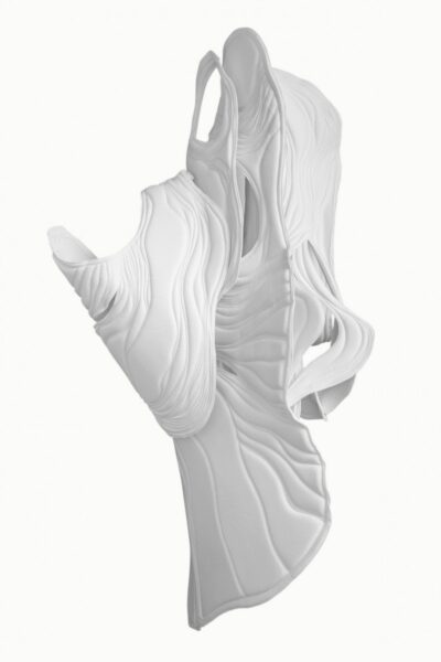 Julio Escudero, another student, uses digital techniques to redefine the concept of the body. The modifiable parameters in the Grasshopper software make it possible to reshape silhouettes – the execution of which is possible by means of23 the Rhinozeros 3D software. Escudero: “Many designers today use parametric design – there is the possibility to visualize the final result without many prototypes. You can also find and correct errors in the program before the piece is made. This saves a lot of time and money. That’s why I like these visualizations. But I only use them as inspiration for silhouettes or shapes and also do a lot of manual work to bring in the human – and new ways of interacting with technology”. In the analog version, Escudero worked with experimental construction techniques, high-precision tools such as laser and CNC cutting, and traditional sewing.
