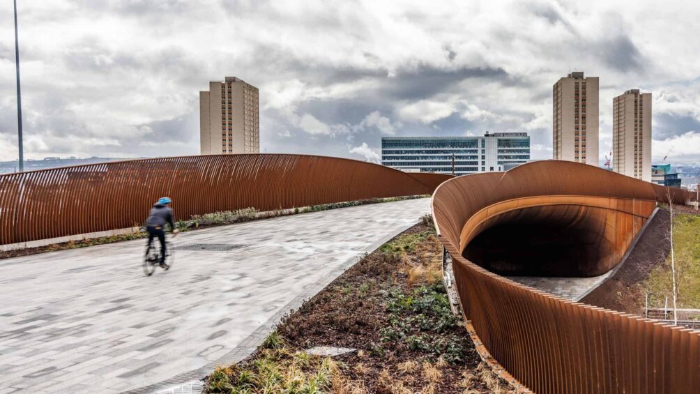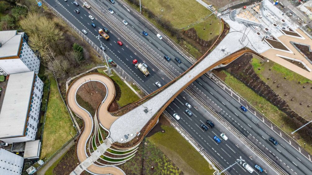 Glasgow’s stunning new “active transport” bridge is now open to the public, connecting over 800 new homes in the Sighthill area to the city center. This innovative bridge is part of a £250 million regeneration project, which is the largest of its kind in the U.K. outside London. The 2,420-tonne structure was installed during a 14-hour closure of the M8 motorway in the summer of 2021. It was opened this week.
