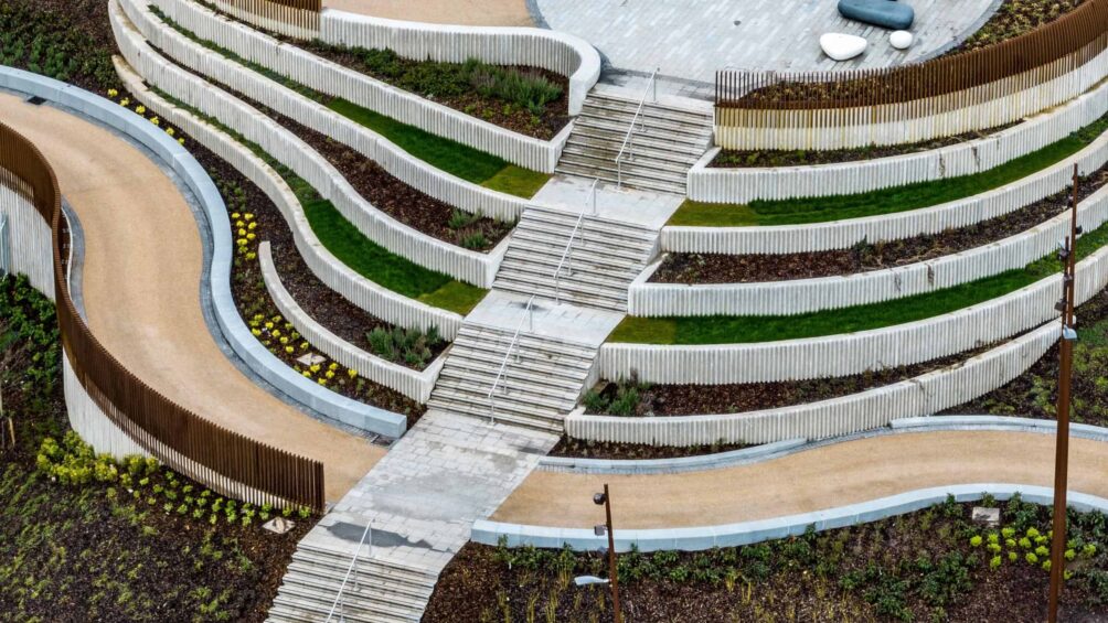 The bridge is manufactured using Cor-Ten steel for a weathered appearance, reducing maintenance costs and reflecting the area’s industrial heritage. The project features the first use of 3D concrete printing in Scotland for the bridge’s staircase, making it the largest printed concrete construction in the UK. Clad in granite, the staircase offers an attractive, long-lasting, and slip-free finish. The bridge’s successful completion showcases the potential of cutting-edge digital techniques and collaboration in construction.