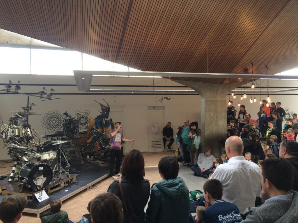 Besides the preparation for the matches, there was much more to see and to do for the visitors. School children from Eindhoven and other parts of The Netherlands came to the RoboCup en masse, to participate in fun technical workshops, like making their own robots, and to be surprised by the many demos, such as the music robots made by Kolja Kugler. These robots, which were making music on real musical instruments, got the attention from a great audience, from young to old, as can be seen on the pictures. This won’t be any different the following days; until Sunday, the robots will play in shows every day at 11:00, 13:00, 15:00 and 17:00. The children that were walking around the Evoluon were also very enthusiastic about the lectures and the cuddle robots, with which they could play and relax for a while. The little dogs and dinos were by far the most popular. Will you come and give it a try this week?
