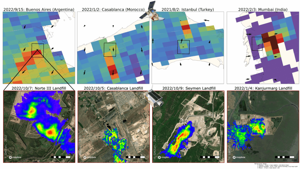 A 2022 publication led by SRON showed that by combining TROPOMI and GHGSat satellite data, large landfill emissions can be detected and characterized. TROPOMI’s global coverage is used to find emission hot spots around the world after which GHGSat’s targeted high-resolution observations are used to find emissions from individual landfills within those hot spots. The study covered four landfills, including one in Buenos Aires whose emissions had a climate impact equal to that of 1.5 million cars.
