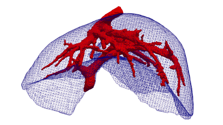 More recently, laparoscopic surgery (also named keyhole surgery), where the surgeon can access the inside of the abdomen through small incisions rather than larger cuts, has proved to reduce the patient’s recovery time and improve their quality of life. But to perform this kind of surgery, you need to insufflate the abdomen with CO2, to create a larger surgical field. And that insufflation as well has an impact on the liver shape. Being able to see the organs only through the laparoscope is also challenging and demands even more accurate 3D models of the liver to make sure the procedure is performed safely.