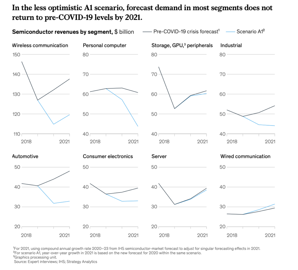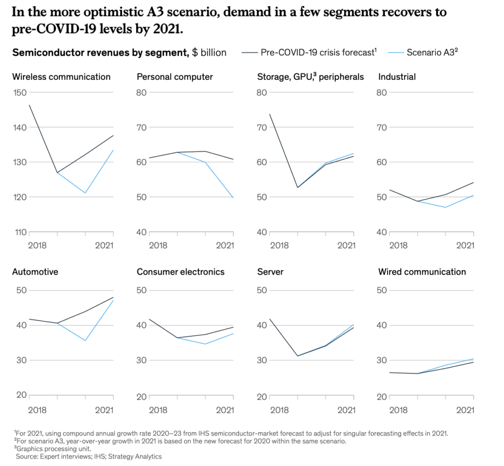 Trends in PCs, automotive and wired communication, stand out, McKinsey says. The PC segment will see the sharpest drop in demand and the performance gap will become more serious over time. “Most people will buy all the home-office electronics that they need for remote work in 2020, lowering demand for next year.” In the more optimistic recovery scenario, the automotive segment sees year-on-year growth of 28 to 36 percent in 2021. “This estimate is based on the assumption that governments will offer incentives to car buyers.” Growth in the segment of wired communication could even exceed pre-COVID-19 forecasts in both 2020 and 2021. “This is one of the few areas where a delayed recovery would actually