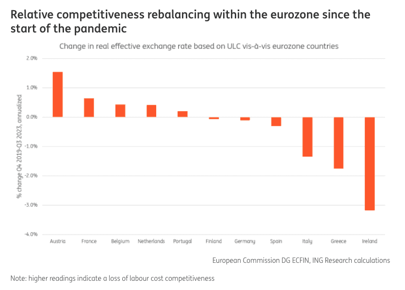 As the European Commission DG ECFIN and ING Research highlight, the Netherlands and Austria are the most affected of the original 12 euro countries since the euro’s inception in terms of labor cost competitiveness. This has implications for future investment decisions, as businesses may seek more cost-effective environments, potentially within the southern European markets that have shown significant improvements.