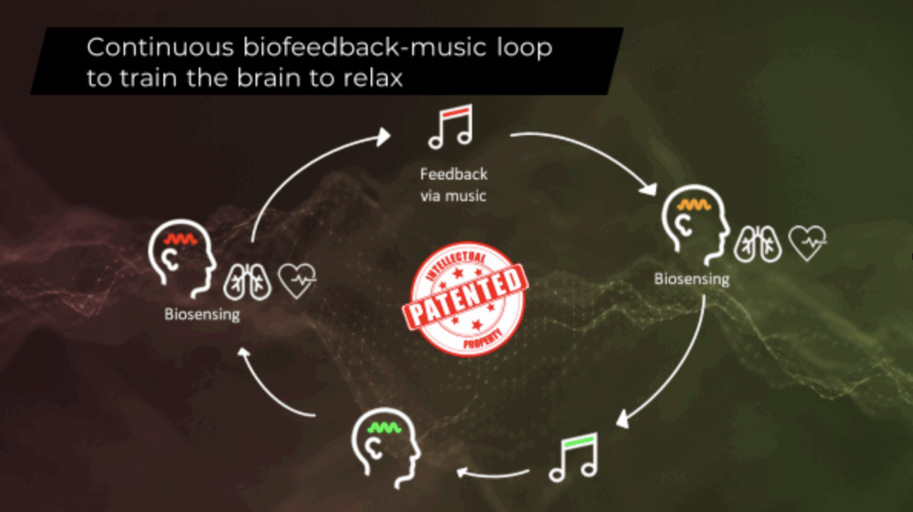 For now, all you need is an app you can download on your smartphone. It measures the breathing of the user and very soon it will also show your heart rate variability and after that an EEG that will show brain activity. This allows us to ‘see’ how tense someone is. Based on these real-time measurements, our patented algorithm adapts your own favourite music in such a way that your brain reacts with relaxation. We can get heart rate and EEG from coupling with smart wearables like watches and headsets.