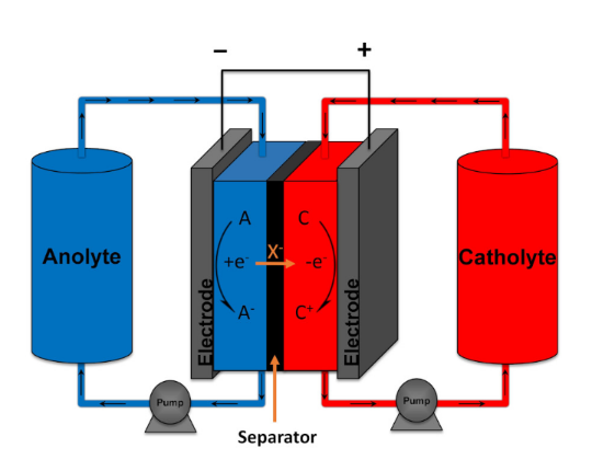The team is developing an iron redox flow battery that stores energy in electrochemical form. A flow battery is made up of two tanks that contain two highly conductive electrolyte liquids separated by an electrochemical cell. The system generates electrical current this way by exchanging negatively and positively charged fluids. That current is captured by electrodes and can then be stored and subsequently used in electrical systems. The two liquids are separated by a membrane.