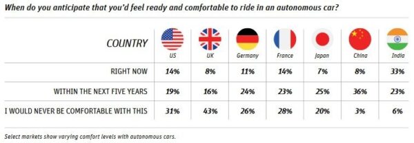 A total of 77% of respondents stated that they would like to use an autonomous car – just not straight away. Only 14% of all respondents would be willing to do so right now. Whereas 50% would within the next five years. However, 23% are not at all comfortable with the idea of ever getting into a self-driving car. In Germany, 74% of people would let their car be in control at some point in their lives. But the top performers in the survey were the Indians. Of those interviewed, 94% would actually like to be able to use autonomous driving vehicles during the next few years. Whereas the British were lowest in the list, with just 57%.