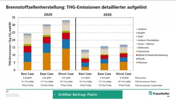 “The study also shows that battery and fuel cell vehicles ideally complement each other. For long distances, fuel cell vehicles are more climate-friendly, and battery-powered vehicles are for short distances,” says Christopher Hebling, Head of Hydrogen Technologies at Fraunhofer ISE. In the period 2020-2030, the GHG-footprint for the production and recycling of a fuel cell system including tank, would correspond to that of an electric drive with a storage capacity of 45-50 kWh. For cars with larger batteries, more GHG would be emitted than for the fuel cell system in a comparable performance class.