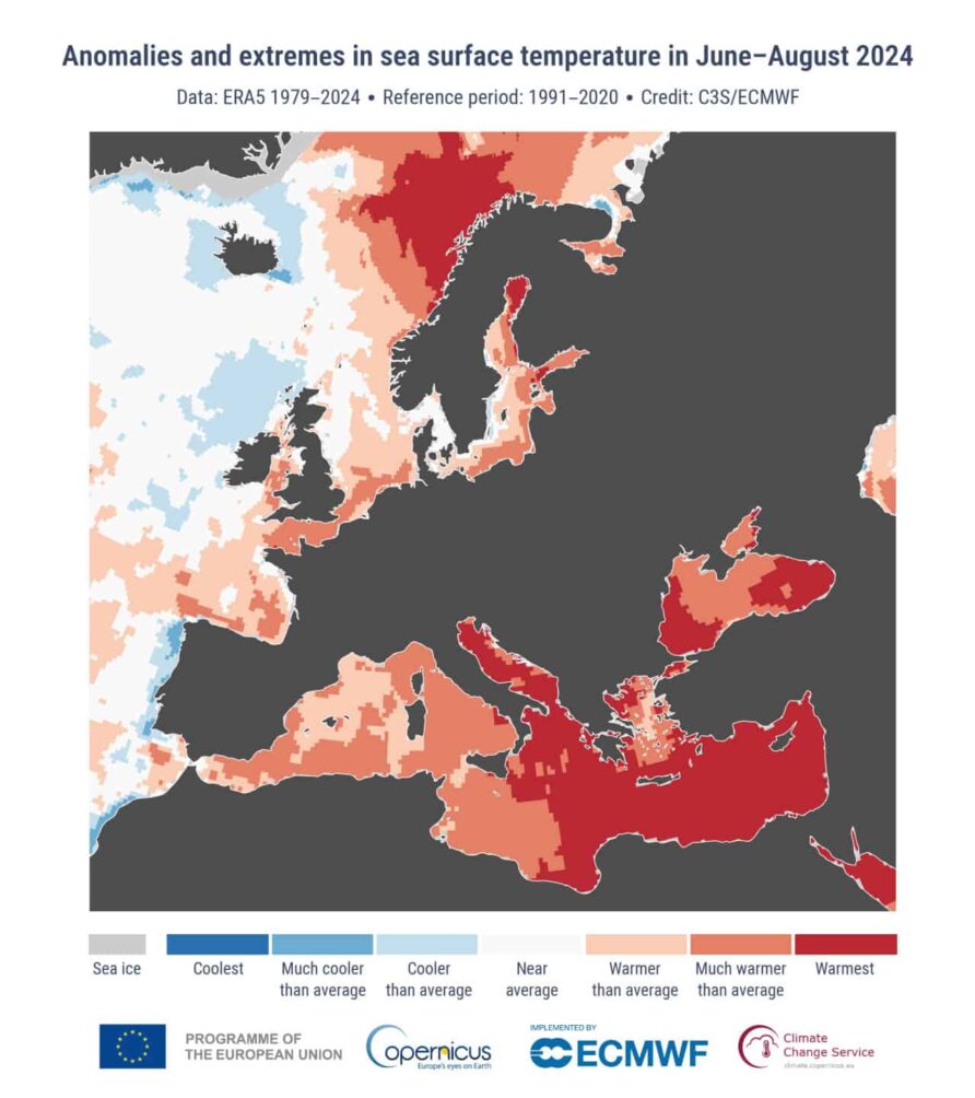 The report also presents figures for sea surface temperatures. Daily sea surface temperatures (SSTs) averaged across the Mediterranean Sea peaked at 28.45 °C on August 13. The figure beat the previous record set in July 2023 (28.20 °C). The averaged data shows temperatures warmer than average in the entire Mediterranean Sea. The waters were warmest in the southeast of the basin, on the coast of Turkey and Greece, and in the Adriatic Sea.