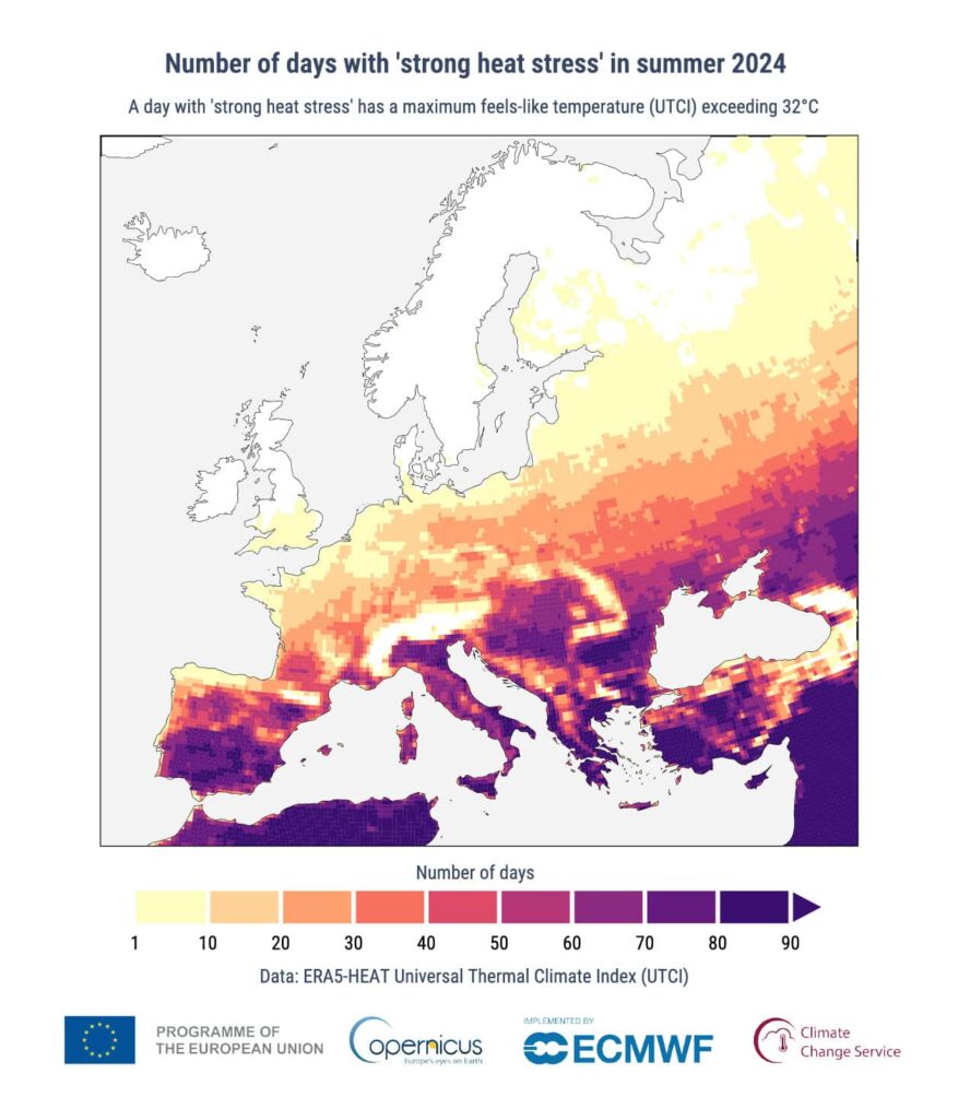 The report also shows the number of days with ‘strong heat stress,’ a day with a maximum feels-like temperature exceeding 32°C. Feels-like temperature also considers humidity, wind speed, sunshine, and how the body responds to different thermal environments. Large stretches of Southern Europe had two full months of strong heat stress, while some areas in Turkey and Greece experienced 90 days of such stress. Very strong heat stress days—maximum feels-like temperature exceeding 38°C —occurred in much of southern and eastern Europe, similar to 2023 figures.