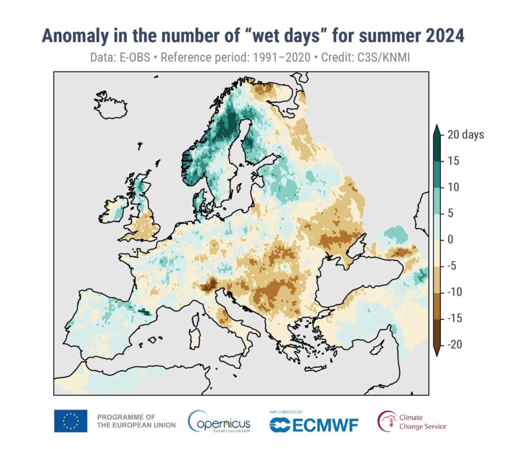 By contrast, northern and western Europe recorded above-average wet days—with more than or equal to 1 mm of rain. The number of rainy days in parts of the Northern UK and Ireland, the Scandinavian peninsula, and the Baltic countries was higher than usual. June was the rainiest month in these areas, while August was drier throughout continental Europe, the UK, and Ireland. By contrast, most Mediterranean areas and the Balkans experienced drought conditions, affecting water availability.