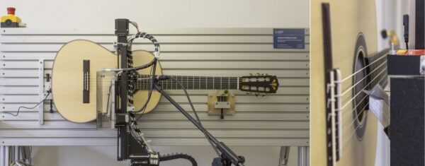 Engineers from TU Dresden in cooperation with the Franconian guitar manufacturer Hanika are now working on this. For their research work, they subjected native woods such as spruce, maple and cherry to a specially developed thermal treatment. And in the meantime, this has become so sophisticated that the research team is convinced that it can offer at least the same acoustic properties as tropical wood. This was demonstrated, among other things, in an acoustic test of the thermally treated wood (see lead picture). The vibration properties are decisive for the sound quality. In addition, there was a plucking test of the guitar (see picture below), which examines how long it takes for a tone to be audible and how long the tone remains audible.