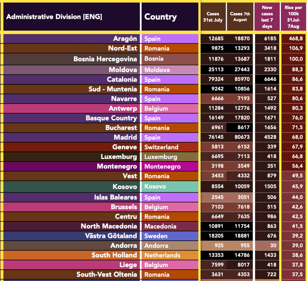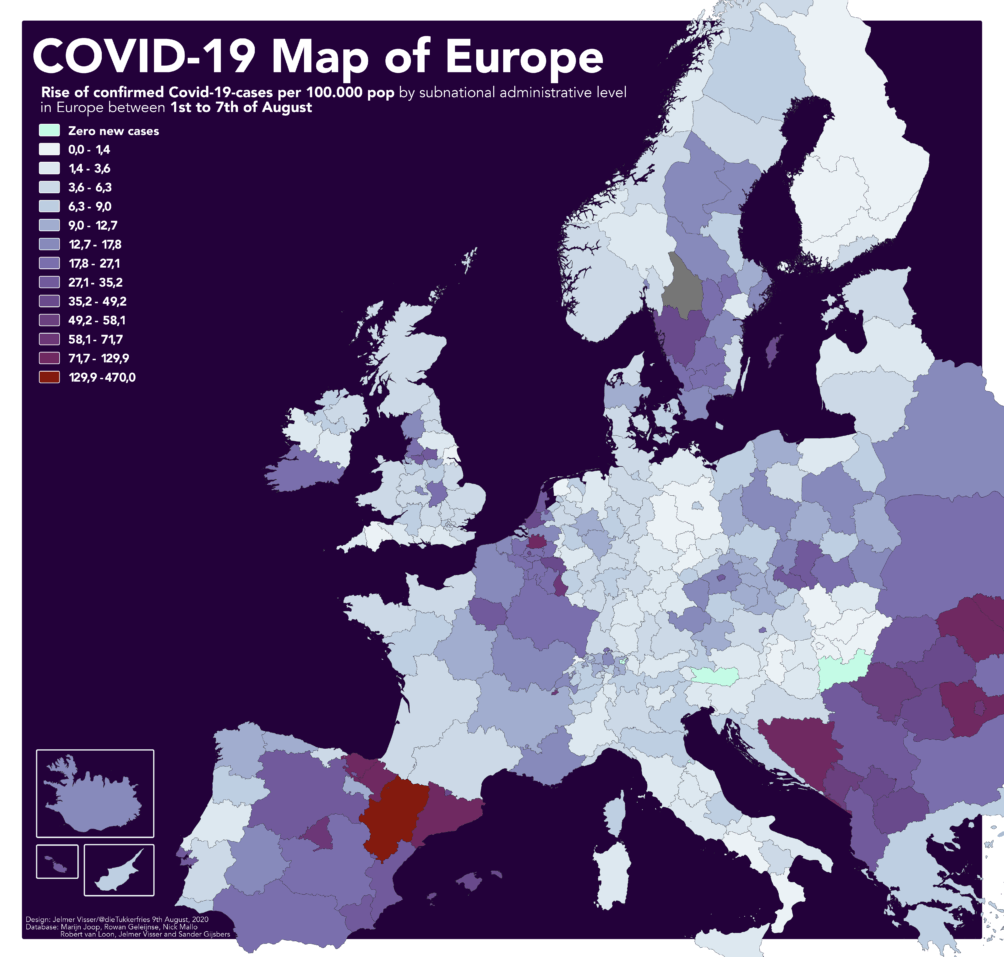 Sweden, that in the months May and June mainly played a negative leading role on these maps, is now hardly noticeable anymore. Spain and Romania are the most active Covid-19 hotspots at the beginning of August. In Spain, this is even so fierce that the legend had to be changed. Aragon, in the northeast of the country, registered such an increase that the maximum value on the map had to be adjusted from 220 to 470.