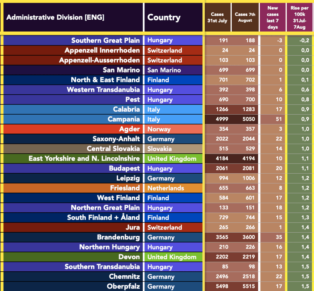 As you can clearly see on the maps, it’s not a pandemic forest fire everywhere. Nevertheless, the ‘green’ areas, that did not exhibit any new diagnoses, have become scarce. Only the small Swiss canton Appenzell and the dwarf state of San Marino kept the ‘zero’ this week. Northern and Eastern Finland did not do badly either, with just one more. This now seems to be the most corona-free area of the whole continent.