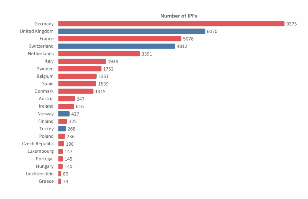 Overall, the European Union ranks second behind the United States, with an 18 percent share of all IPFs from 2002 to 2021. In Europe, Germany has maintained its position as the leading home country in cancer-related innovation for more than 20 years, while the United Kingdom has quickly risen to become the second largest contributor, followed by France.