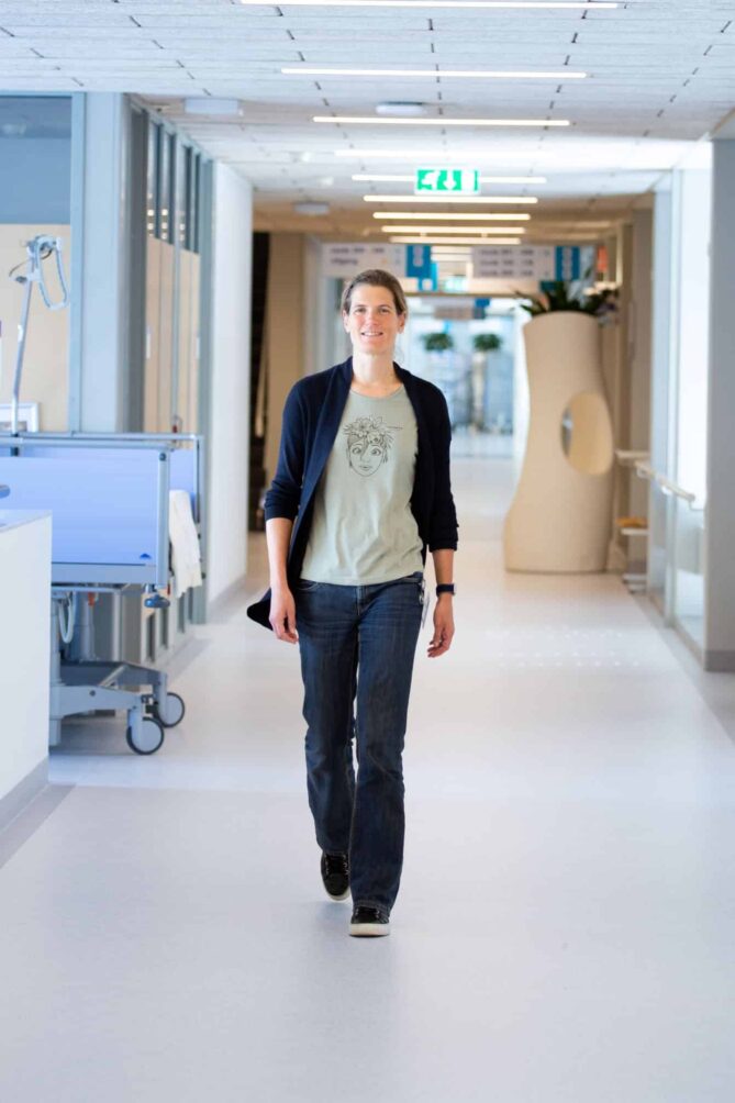 To change that, one of the things she is working on is the development and implementation of new sensors that do not adhere to stickers but are under the mattress. Some sensors can measure specific data with a wireless, soft band. “That way, a premature baby’s skin doesn’t get damaged and is much more comfortable. Wireless sensors make it easier for parents to hold and care for their babies. This is essential for the bond between parent and child. Moreover, pouching (skin-to-skin contact, ed.) is good for a baby’s development and growth.”