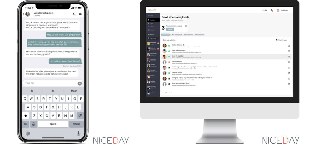 A practitioner is able to chat and call a patient via NiceDay. This way, the practitioner really becomes part of someone’s life and can better monitor and guide them wherever that’s needed. “Screen-to-screen seems less personal, but our experience is that people are more open to the practitioner because they are in their own surroundings. The therapeutic relationship is improved and that contributes to recovery in a positive way.”