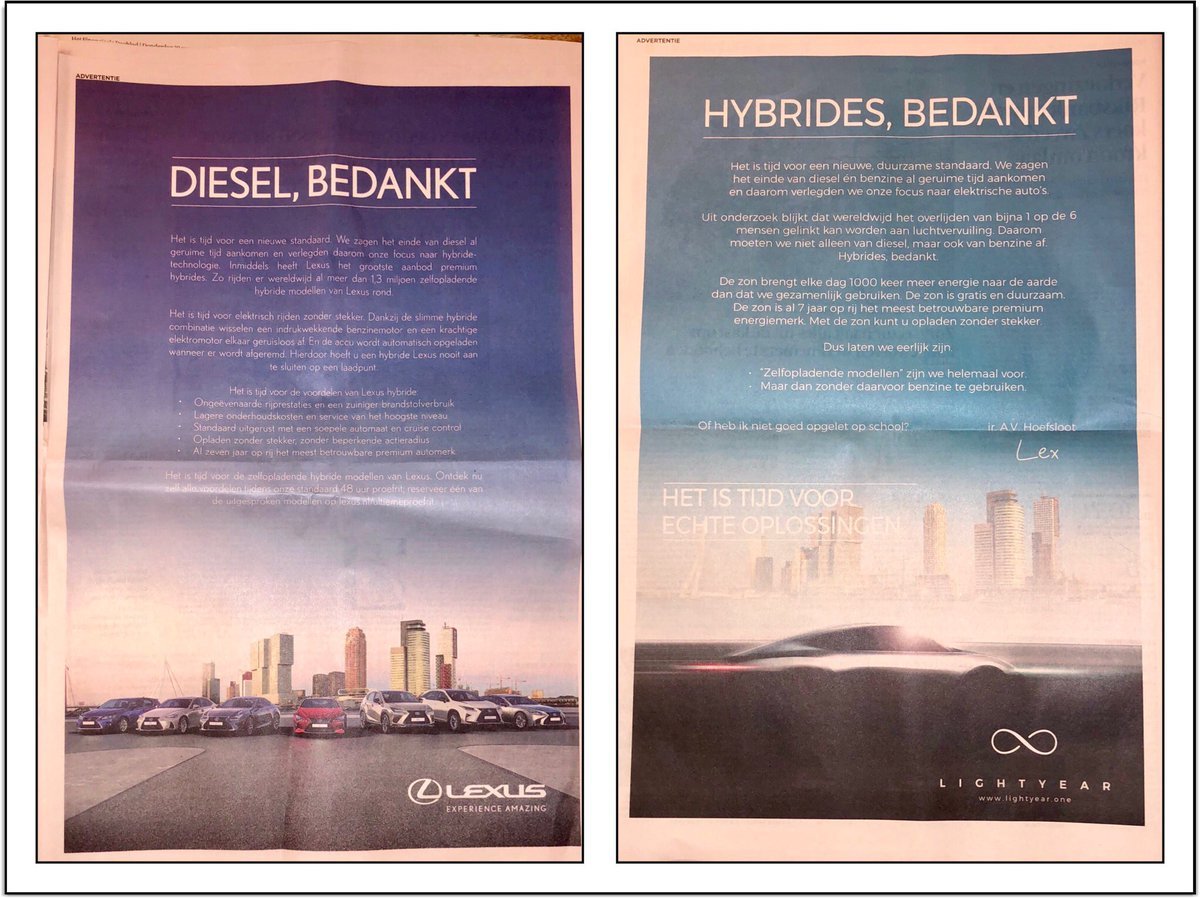 In addition, we at Lightyear were slightly outraged by Lexus’ claim that this technology marks ‘the start of a new era’. Toyota’s first hybrids date back to 1997, a year in which the advertisement would have been in place. Hybrids have made the step towards electric smaller and that has been enormously good for the acceptance of electric cars, of course, we recognise that. All hybrids together already have a commendable amount of electric kilometres, but in our view, it is and will remain just a temporary solution. That’s why, in response to this, we also placed an ad in the same week and called on the automotive industry to come up with #realsolutions.