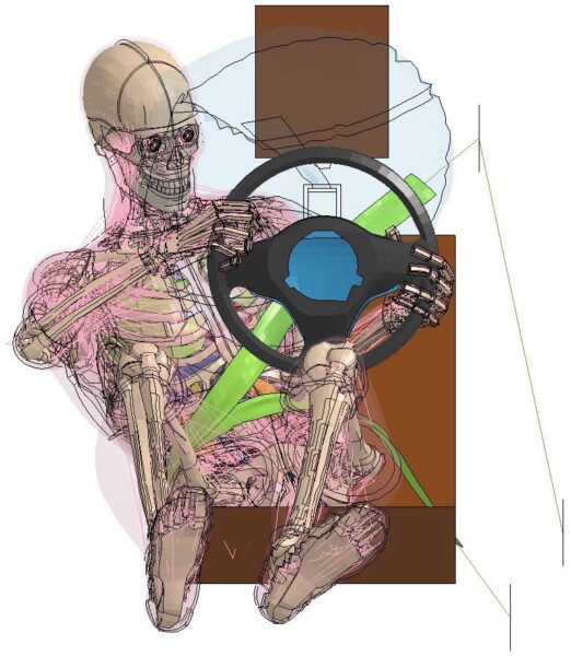 The above picture also simulates a frontal crash in the tense muscle condition of the human model THUMS. Through active muscle contraction, THUMS holds on to the steering wheel and supports itself during the impact of the crash. This potentially relieves the chest. The colored octahedrons make the various buckle points of the modelled seat belt visible.