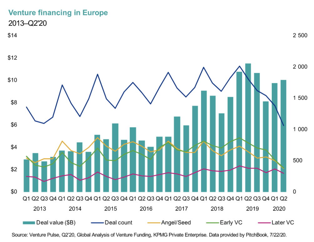 Despite the corona crisis, venture capitalists continue to invest heavily in European start-ups. In the first six months of this year, according to calculations by KPMG, an amount of $19.9 billion was invested in start-ups. That is $1.1 billion more than in the last six months of 2019. However, the number of transactions fell sharply, from 1,383 in the last six months of last year to 1,062 in the first half of 2020.