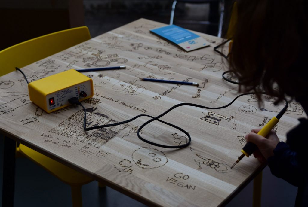 In the end, a meeting space of 90 square meters was created in the new Aurora complex, which Sinte Maartensdijk and the residents set up together. Large lego blocks were used to determine the layout, wooden tables were used to make games with wood burners, and light boxes were provided with stencils to create a better atmosphere. The residents did the decoration themselves. The designer discovered that it works well if you offer the students something restful to do. “These students are all very busy. They need everything for their study and research. But with this wood burning activity, some people stayed half an evening. We really had to send people home.” During DDW, visitors can also burn shapes in a wooden table.