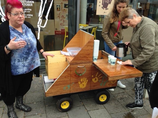 Theuws wanted to do something about the community in the district, nobody greeted each other and the district had a bad name. People call it ‘Boevering’ a place for thiefs,”, says the inhabitant who moved from Bergeijk to one of the seven flats of the Coevering five years ago. Even before she got the cart, she went to the nearby Strabrechtse Heide with two bottles of coffee in her mobility scooter. She wanted it differently and applied to the Woonbedrijf neighbourhood culture fund. She came into contact with designer Tsjalke Bouma. With h, r she invented the ‘Get together cart’ with which she goes to the forest every Wednesday and Saturday afternoon since 29 June 2014.