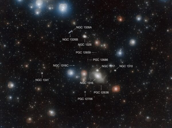 Through gravitational distortions over the course of it time, the galaxy formed its lenticular structure and pronounced wave structures, rings, and circular arcs in the starry outer shell. The mergers resulted in an inflow of gas and a supermassive black hole at the center with an estimated mass of 150 million solar masses. NGC 1316 is the brightest galaxy of the Fornax cluster.