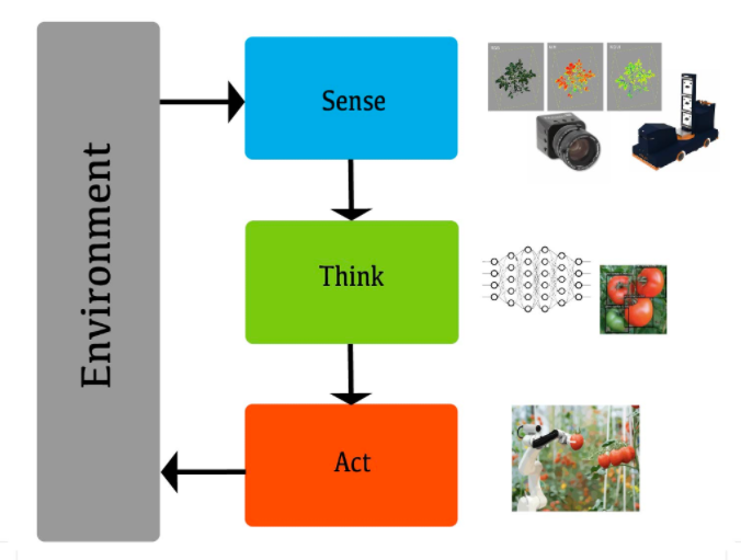 The second step, think, is about making decisions based on what is observed in the environment. The data collected in the first step is analyzed and a decision is made on what should be done. In the example of the tomato picking robot we have to determine whether the tomato is ripe and needs to be picked. Models and artificial intelligence play an important role in this.
