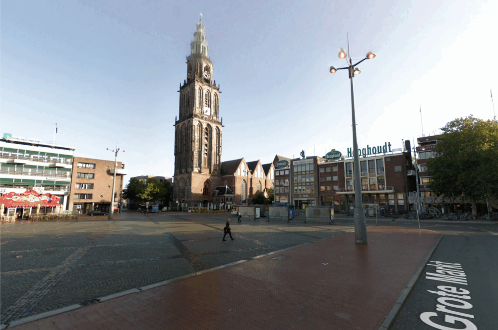 Even though Groningen remained almost two degrees cooler according to the KNMI, the historic city center is heating up much more and on a larger scale than Tilburg. The iconic Grote Markt forms a kind of hot core of a very expansive heat island that runs roughly from the Rijksuniversiteit (university) complex to the Vismarkt and actually includes all the surrounding streets up to the Gedempte Zuiderdiep with values around or well above 45 degrees Celsius.