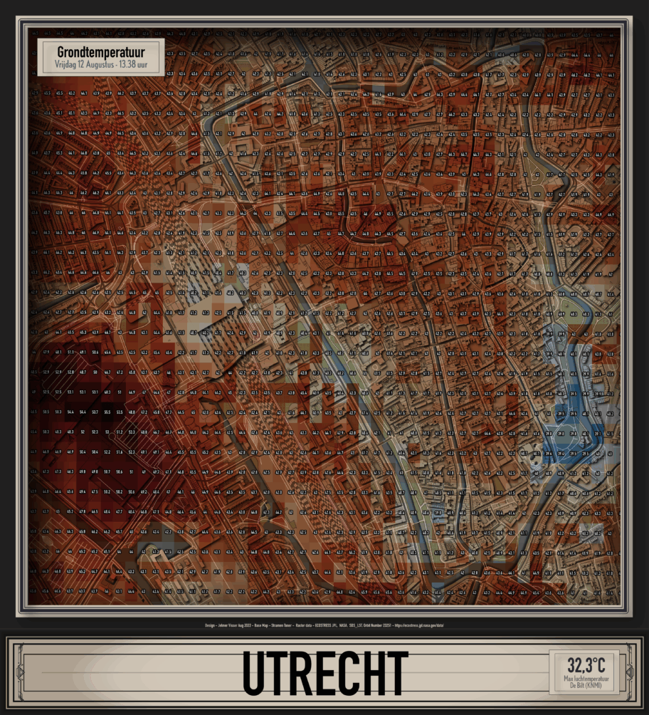Also, the colors per map are slightly skewed, which means that the same colors on map A do not necessarily correspond to those on map B. This is why the data from the NASA measurements are also expressed numerically. On a sunny summer day like Friday, August 12, it is almost always hotter near the ground surface than on the weather maps provided by the KNMI. Consequently, the frames show what the maximum air temperature was according to the nearest weather station.