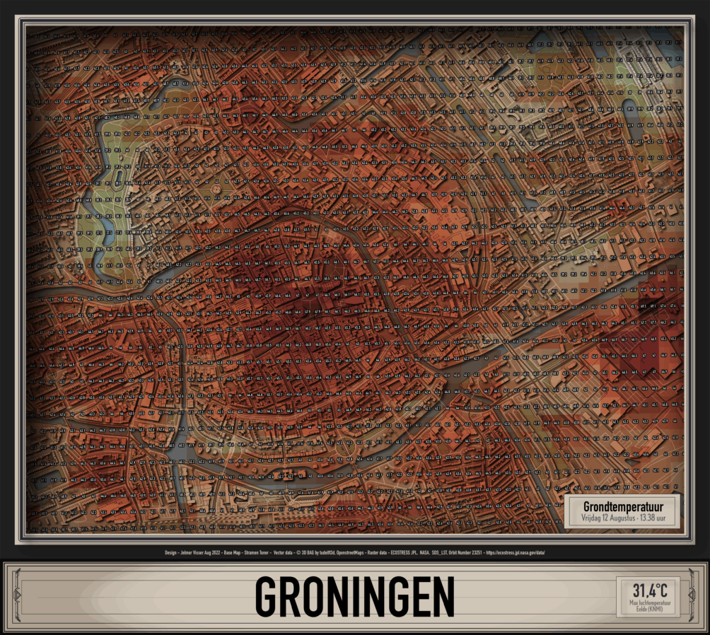 So, is there nowhere you can find some coolness in the 050 zone on hot summer days? Yes there sure is! In the Noorderplantsoen, the ground stayed below forty degrees C in most places. Further east, the Oosterpark and Pioenpark fulfil the role of oases. Moreover, these green areas exude their influence quite considerably, making it also relatively agreeable to spend time in the surrounding residential areas as opposed to the hot historical heart of the largest city in the North of the Netherlands.