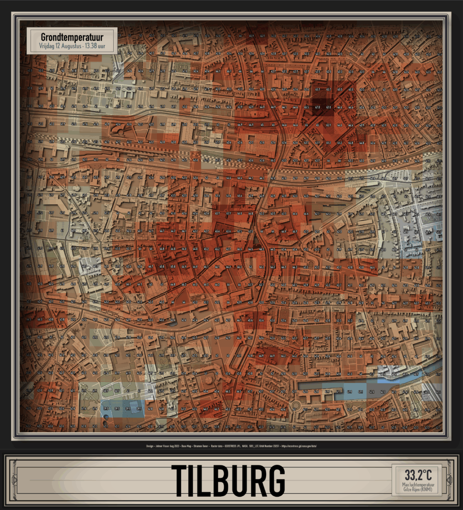 Despite the fact that the nearby Gilze Rijen airport, with a temperature of 33.2 degrees C, was home to the warmest weather in the Netherlands on August 12, NASA Ecostress data shows that Tilburg is definitely not one of the worst offenders as far as heat islands are concerned. Nowhere in the center does the mercury hit 47 °C. You can zoom in even further by using the interactive tool below.