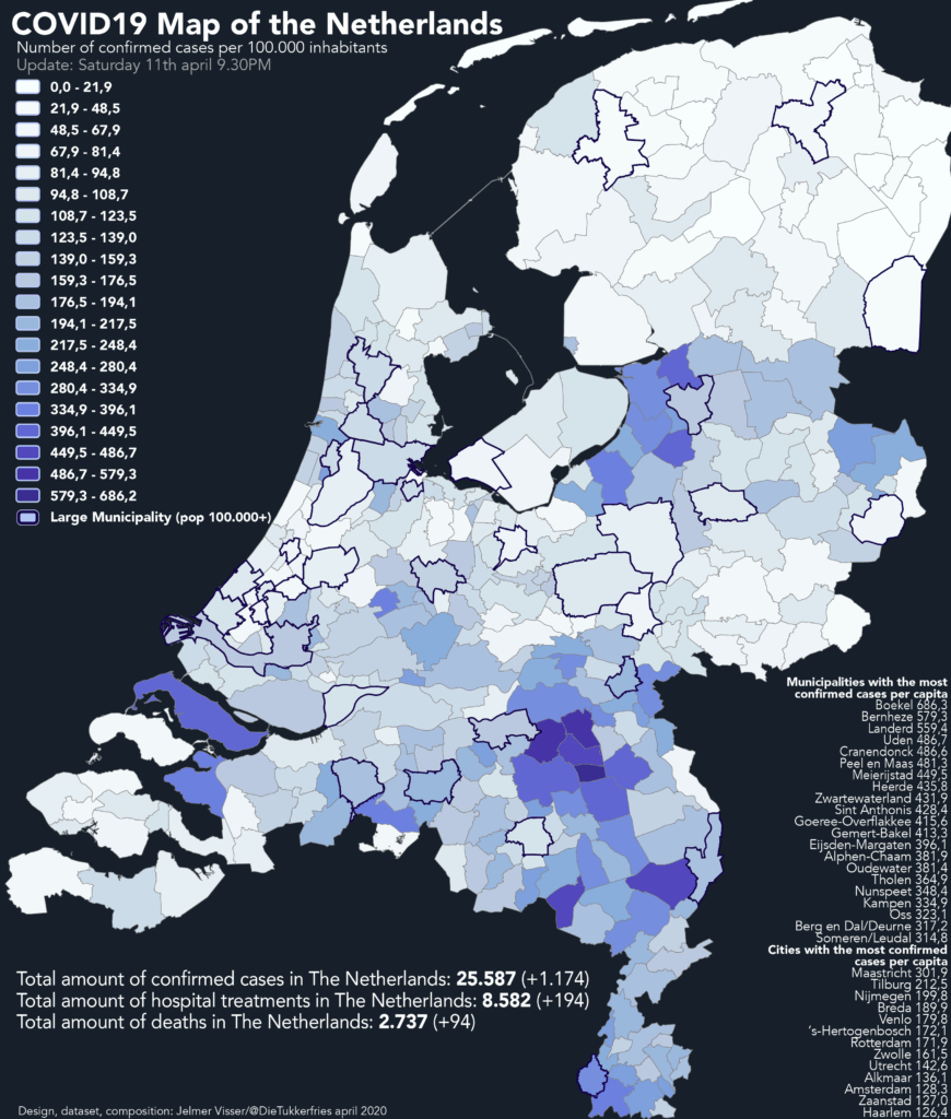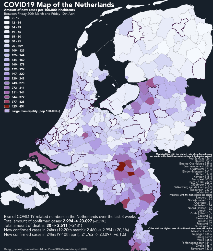 This chart shows the progression of the number of confirmed diagnoses between 20th of March and the 10th of April. Although it doesn’t reflect the transmissions that took place before then. Tilburg and Breda, which topped the worst lists in the early days, hardly stand out anymore. In the meantime, the Zwolle region seems to have been transformed into an oil slick that stretches from Hardenberg to Harderwijk. Limburg is also far from being rid of this scourge.