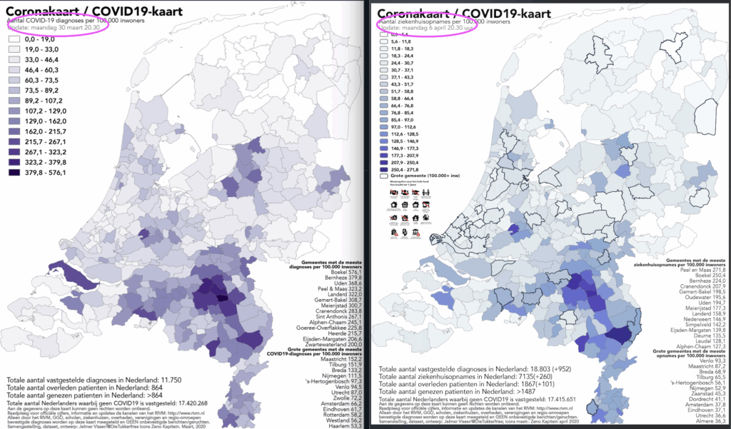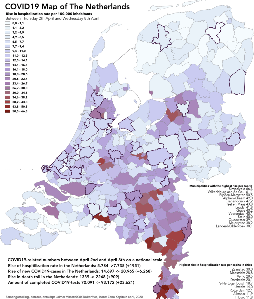 Three weeks is still quite long. Let’s zoom in on the last week for a more recent rundown of the spread. Note, however, that this can only be done with the hospital admissions figures, because the RIVM (the Dutch National Institute for Public Health and the Environment) did not release diagnostic figures at a municipal level between 30th of March and the 8th of April. If you take a closer look at the increase between the 2nd and the 8th of April, the Zaanstreek area has now turned a few shades darker.