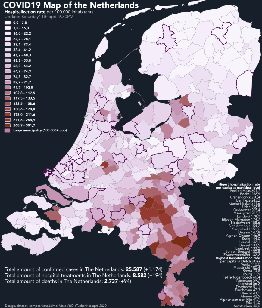 Nonetheless, even here more factors and nuances should be taken into account. For example, there are municipalities with lots of admissions yet just a few diagnoses. This incongruity is quite evident in larger municipalities. In Venlo, Zaanstad, and Almere, for example, relatively high rates of COVID-19 patients end up in hospitals compared to other cities. Do they live unhealthier lives? Most likely. But these are not student cities either, so it is quite plausible that more elderly people live there. On the April 11 diagnosis chart here below, there doesn’t seem to be much going on in these places. Why is that?